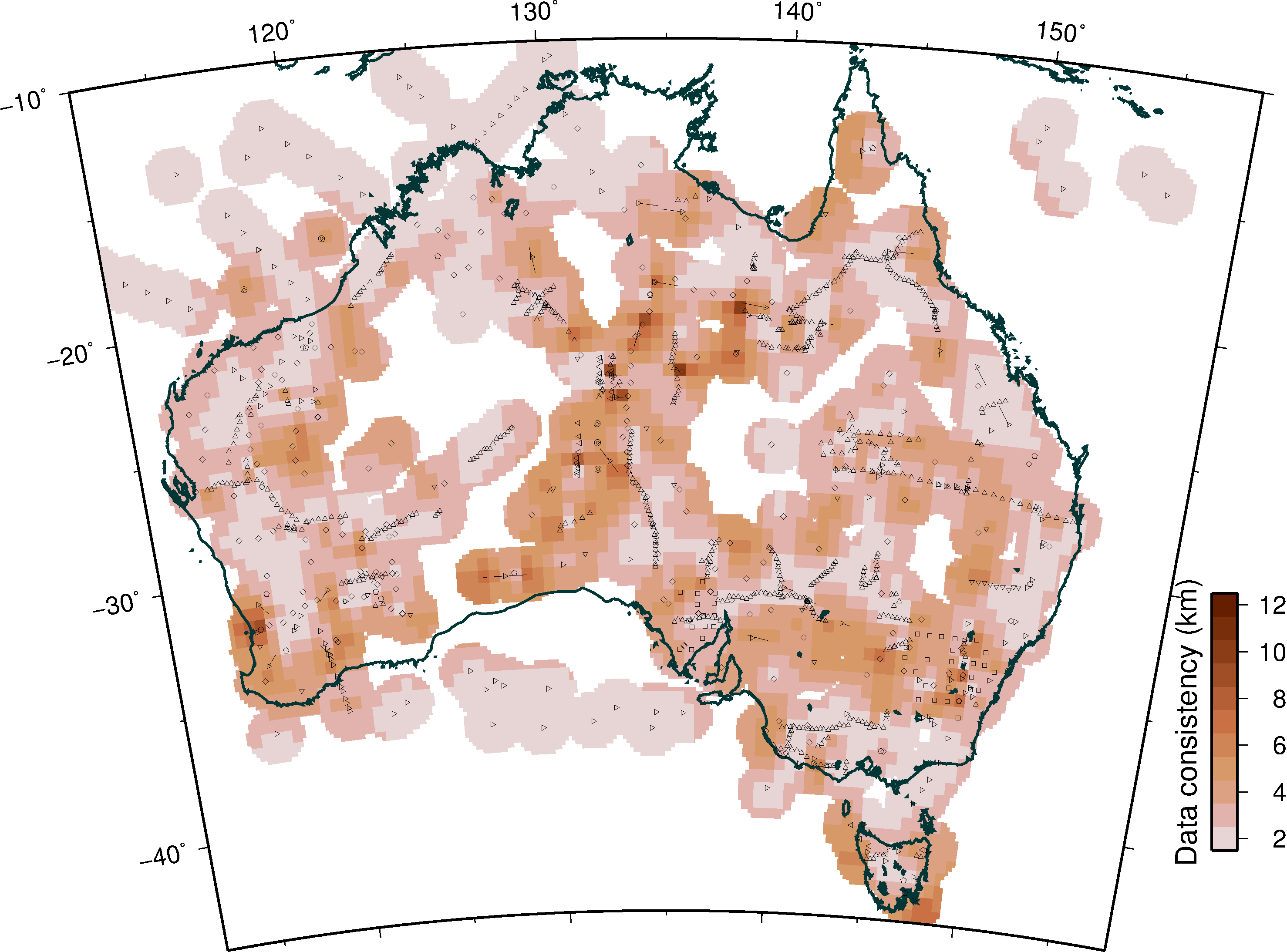 Map of consistency of the Moho depth estimates from the different styles of data. The influence of the points is allowed to extend to a radius of 125 km. Where multiple estimates occur in a single pixel the weighted standard deviation is plotted. Where there is only a single estimate in a pixel the consistency value is calculated as 12*10w, where w is the weighting applied to the data value, a minimum value of 2 km is employed where two values in a pixel agree.