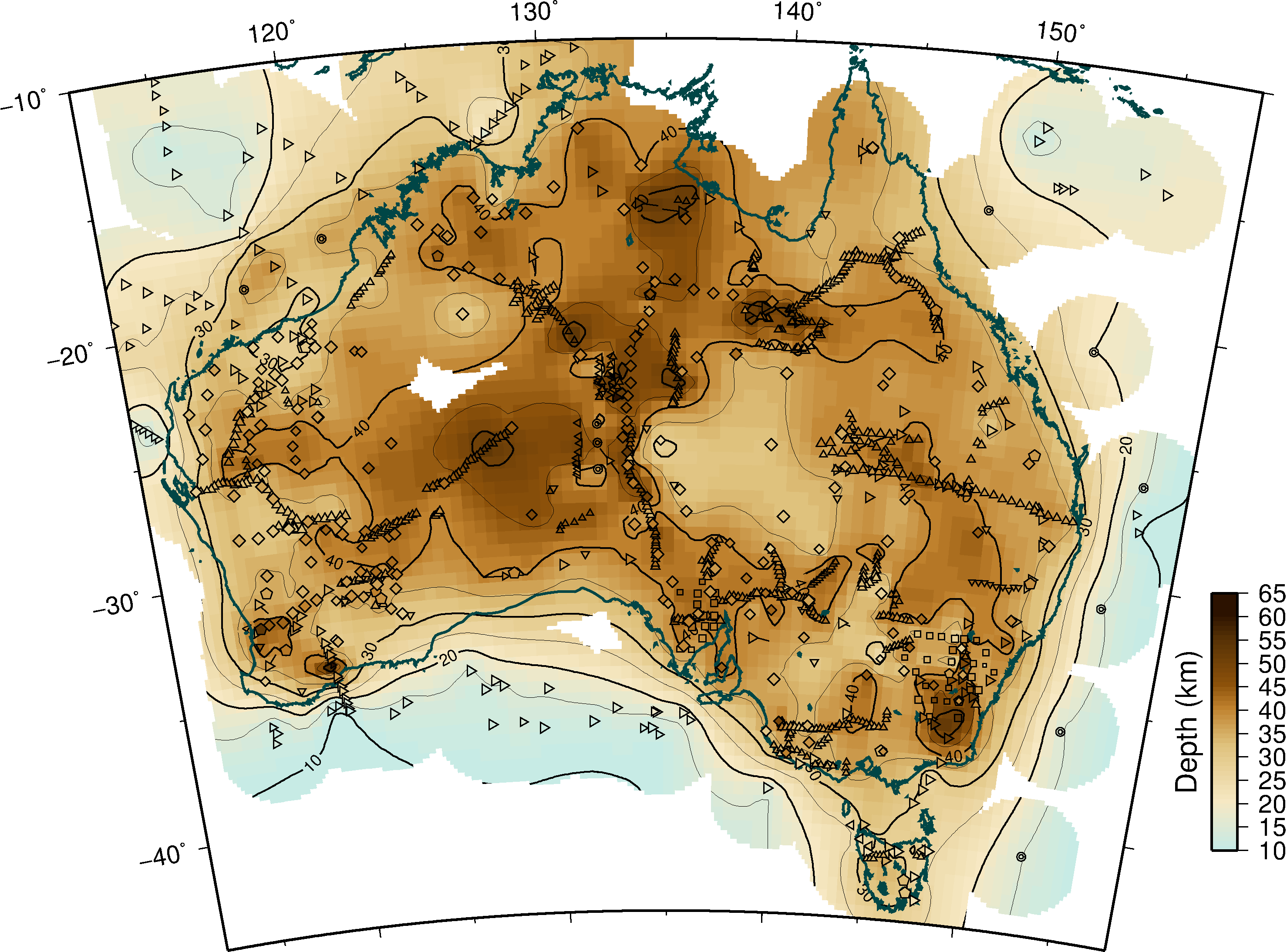 Kennett, B., Salmon, M., Saygin, E. and AusMoho Working Group., AusMoho: the variation of Moho depth in Australia, Geophysical Jounral International, 187, 946-958, 2011, doi:10.1111/j.1365-246X.2011.05194.x